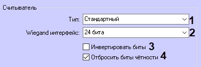 - Из раскрывающегося списка Wiegand интерфейс (2) выбрать количество считываемых бит карты: Все биты, 24 бита (по умолчанию), 16 бит (только номер карты), Формат А.