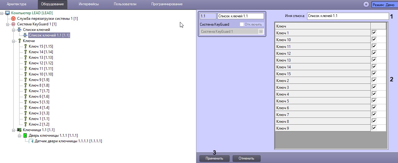 - В поле Имя в списке (1) указать имя списка ключей, которое будет отображаться на экране ключницы.