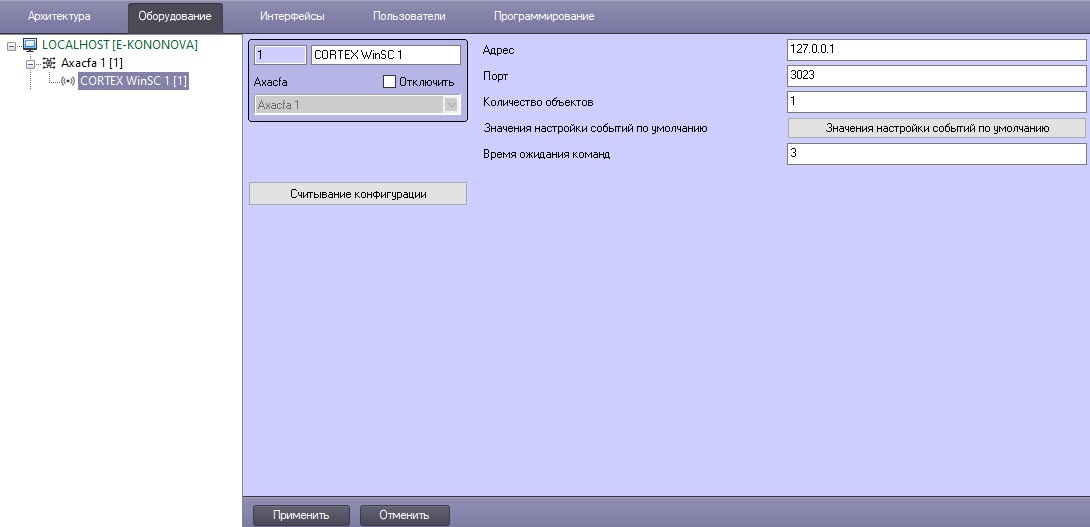 - На базе объекта Axacfa создать головной объект CORTEX WinSC на вкладке Оборудование окна Настройки системы.