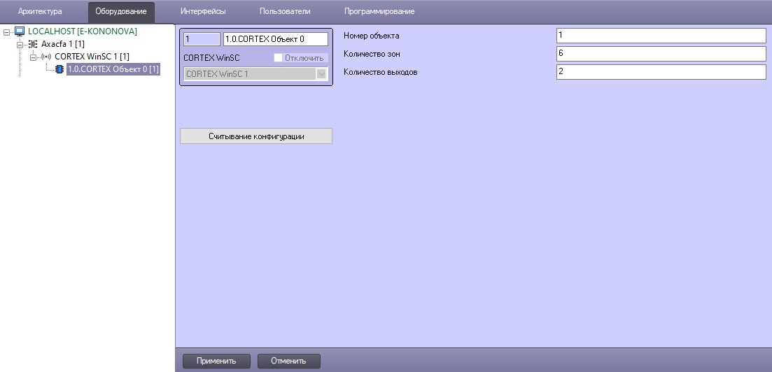 - Перейти на панель настроек объекта CORTEX Объект, созданный на базе головного объекта CORTEX WinSC в результате считывания конфигурации (см. на странице Настройка головного объекта CORTEX WinSC).