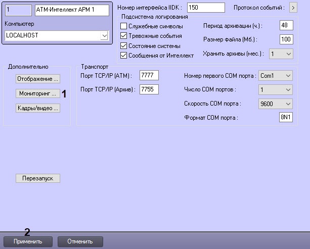 13. Для сохранения изменений нажать кнопку Применить (2) на панели настройки объекта АТМ-Интеллект АРМ.