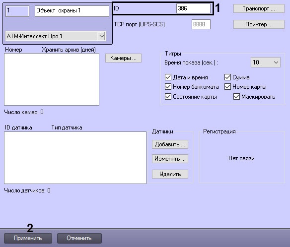 В поле ID ввести уникальный номер объекта, на котором устанавливается АТМ-Интеллект Про (1). Может содержать от 1 до 9 символов.