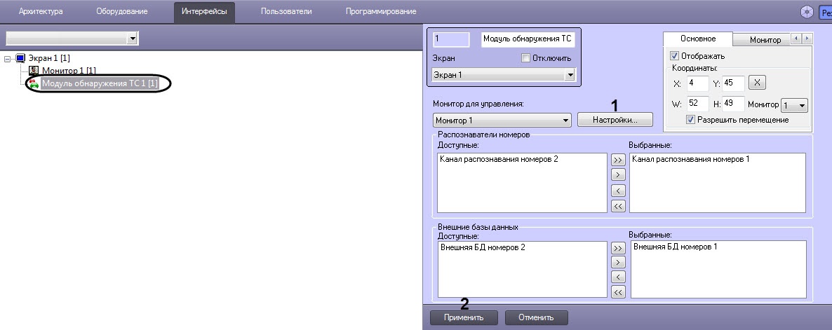 Настройка интерфейса окна Модуль обнаружения ТС завершена.