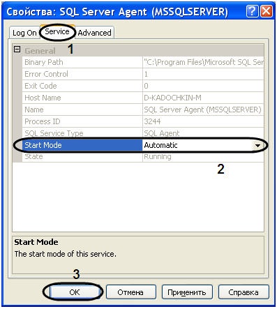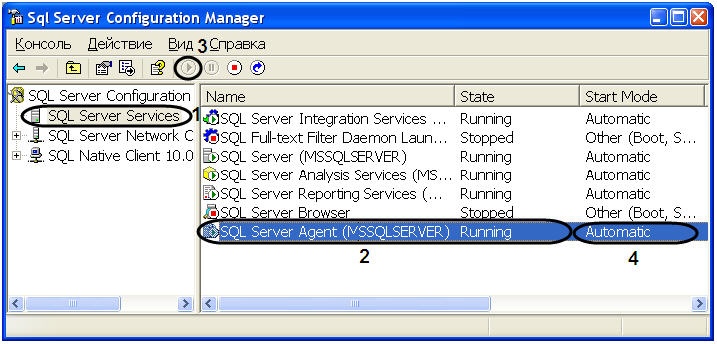 4.2 В том случае если служба Sql Server Agent (MSSQLSERVER) не запущена, необходимо запустить ее, нажав кнопку Play на верхней панели управления (3).