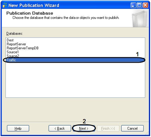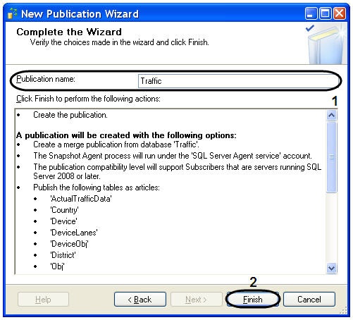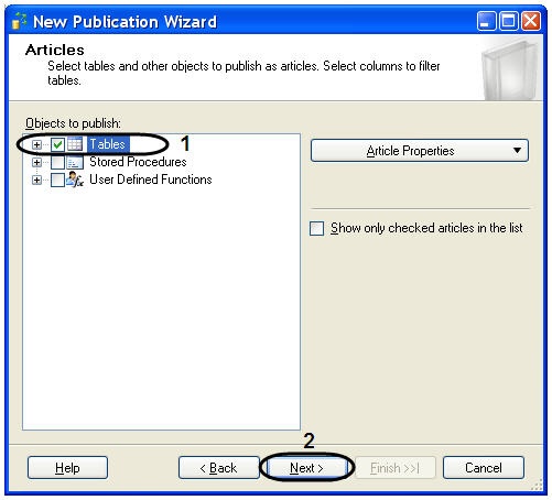 10.7 Указать объекты базы данных для включения в публикацию, установив флажок Tables (1).