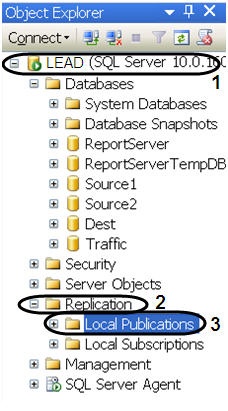 - Раскрыть папку Replication (2), после чего щелкнуть правой кнопкой мыши по папке Local Publication (3).