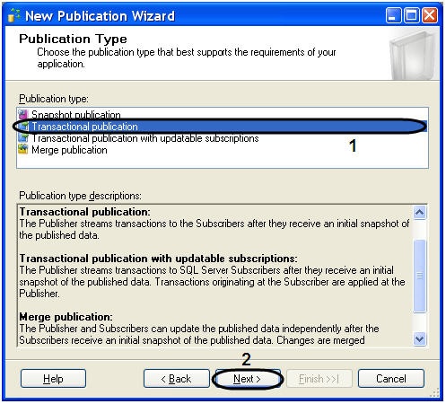 10.3 Выбрать значение типа создаваемой публикации из списка Publication Type - Transactional publication (1).