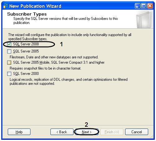 10.5 Указать тип подписчика, установив флажок Sql Server 2008 (1).