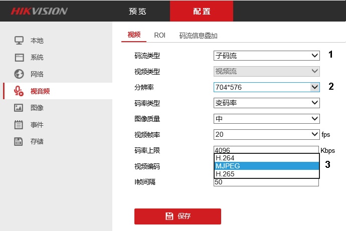 - Из раскрывающегося списка 分辨率 (Разрешение) выбрать разрешение вспомогательного потока (2).