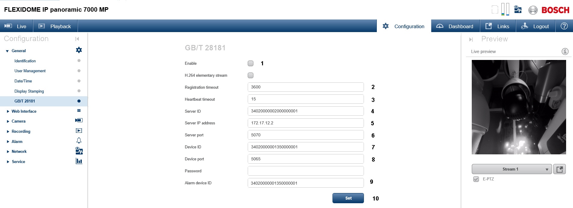 Настройка камеры Bosch для работы по стандарту GB/T28181 осуществляется в следующем порядке:
