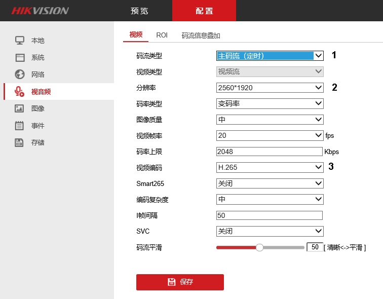 - Из раскрывающегося списка 分辨率 (Разрешение) выбрать разрешение основного потока (2).