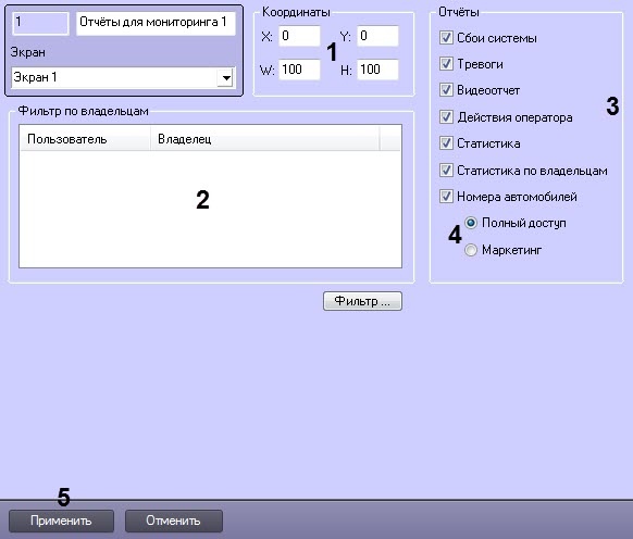 - Настроить фильтр по владельцам по аналогии с интерфейсным объектом Мониторинг – см. Настройка интерфейсного объекта Мониторинг.