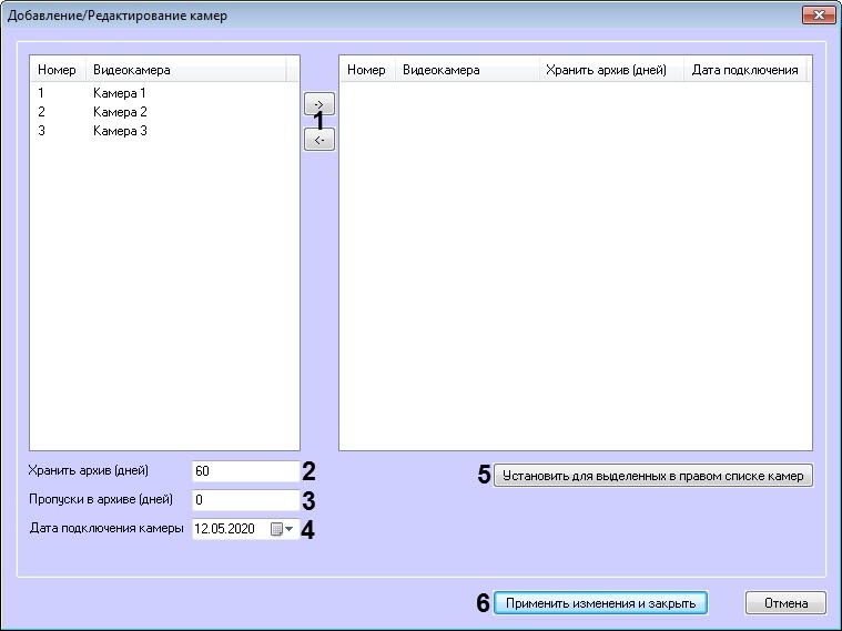 из левого списка в правый (1). - Выделить видеокамеры в правом списке.