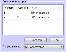 3. На вкладке Настройки оператора объекта SIP-панель 2 и выполнить настройку списка SIP-операторов как показано на рисунке ниже (см. Настройки оператора интерфейсного объекта SIP-панель).