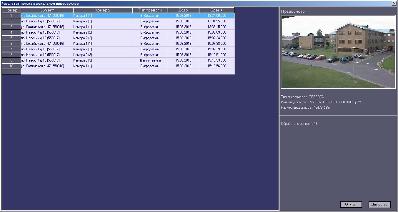 - видеокадры – тревоги. Это видеокадры, полученные после срабатывания на объекте тревожного датчика (Вибродатчик, Датчик открытия замка и т.д.).